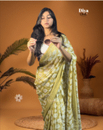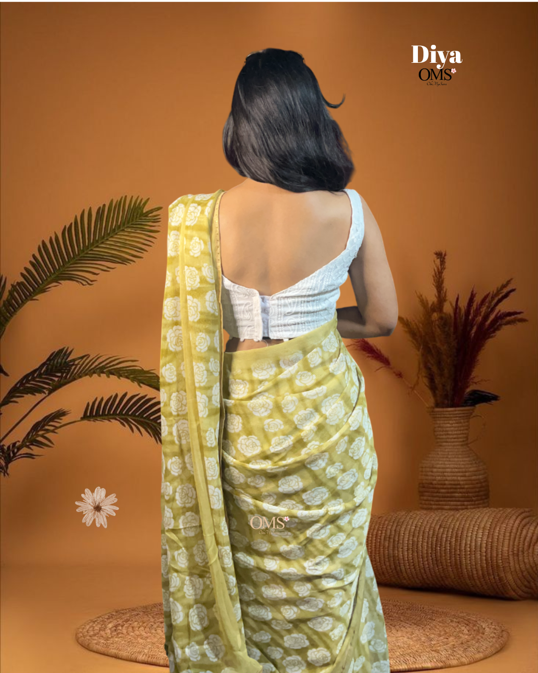 Step into a world of gentle elegance with Diya. Designed in a soothing yellow-green shade and adorned with delicate floral prints, this saree brings together comfort and charm in the most beautiful way. Its lightweight flow makes it perfect for daytime outings, festive moments, or simple celebrations where you still want to shine.