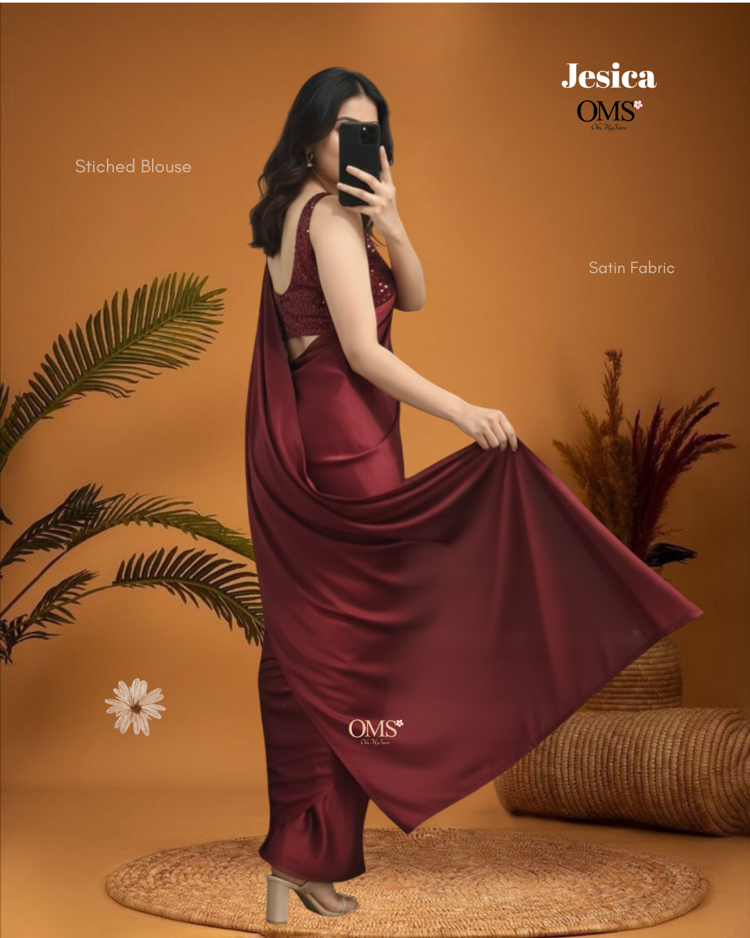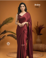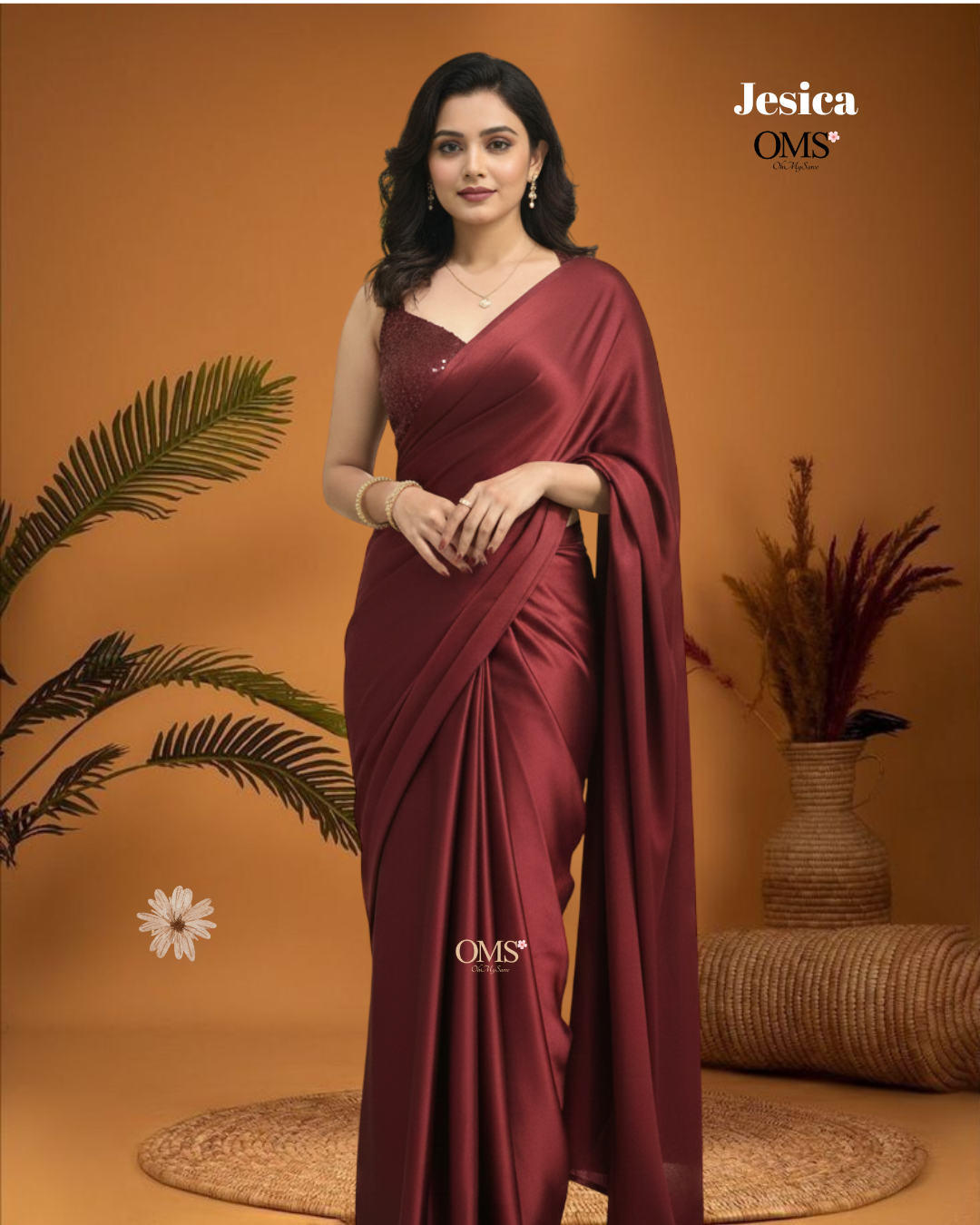Jesica – Wine Satin Grace is a statement of understated luxury. Crafted in smooth satin fabric, this saree drapes beautifully and reflects a soft sheen that elevates its rich wine hue. The subtle border detailing enhances the overall look while keeping it refined and modern.