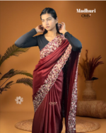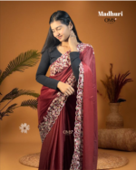The Madhuri (Fabric Star Georgette) – Velvet Bloom Edition is a saree that beautifully blends traditional grace with modern sophistication. Its deep maroon shade exudes richness, while the intricately embroidered floral border adds a luxurious, standout appeal. Perfect for weddings, festive functions, and elegant evening events, this saree instantly elevates your presence with its refined detailing and smooth drape.