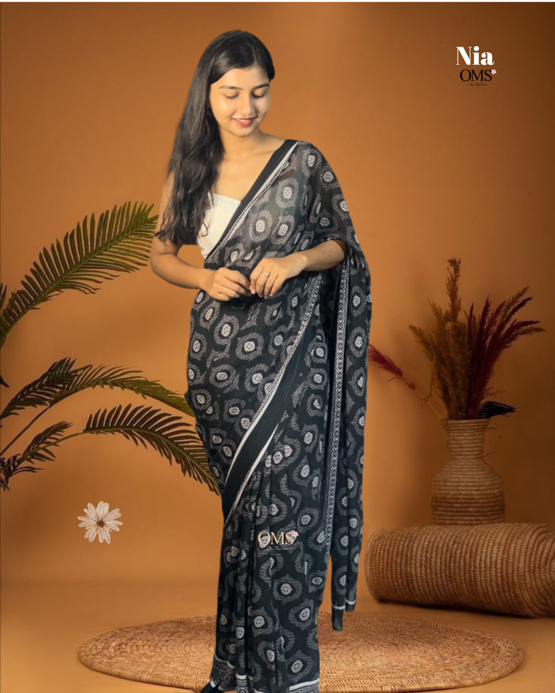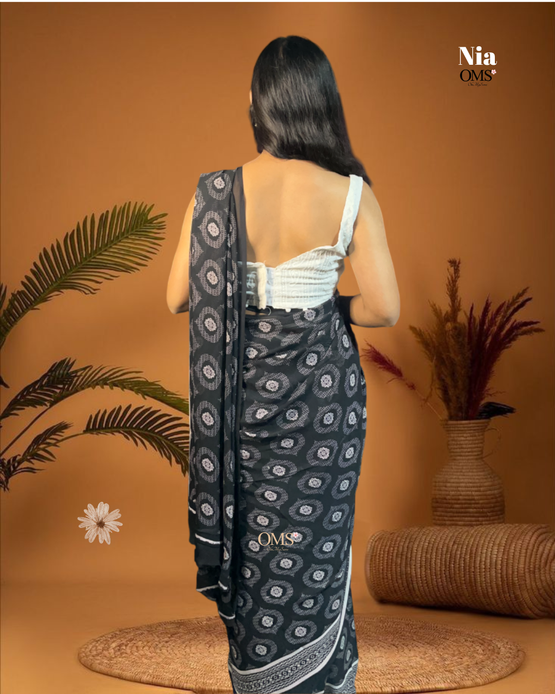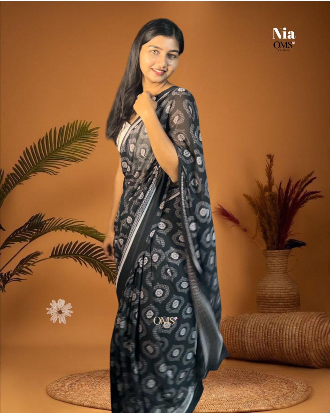 Discover Nia – The Essence of Everyday Elegance, a black printed saree crafted to bring grace and comfort into your daily wear. Its timeless design features subtle prints that radiate simplicity while maintaining a modern charm. Made from soft, breathable fabric, Nia keeps you comfortable all day long — perfect for work, casual outings, or relaxed evenings.