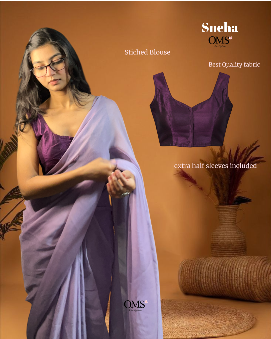 Sneha – Soft Lavender Grace is designed for effortless elegance and everyday comfort. Crafted in a soothing lavender tone, this saree offers a soft, flowy drape that feels light and graceful on the body.